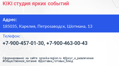 KIKI, студия ярких событий по адресу 185035, Карелия, Петрозаводск, Шотмана, 13 в дальнейшем Организация, размещена в следующих категориях: