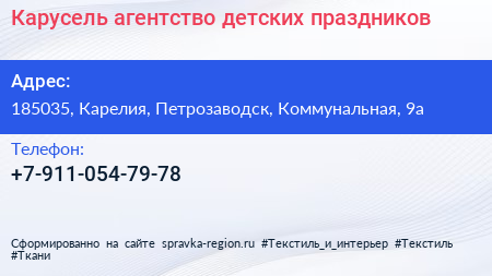 Карусель, агентство детских праздников по адресу 185035, Карелия, Петрозаводск, Коммунальная, 9а в дальнейшем Организация, размещена в следующих категориях:
