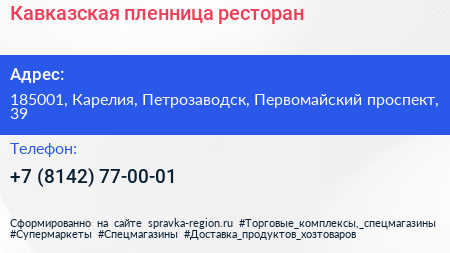 Кавказская пленница, ресторан по адресу 185001, Карелия, Петрозаводск, Первомайский проспект, 39 в дальнейшем Организация, размещена в следующих категориях: