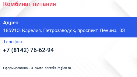 Комбинат питания по адресу 185910, Карелия, Петрозаводск, проспект Ленина, 33 в дальнейшем Организация, размещена в следующих категориях: