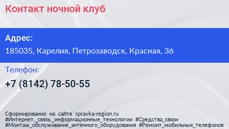Контакт, ночной клуб по адресу 185035, Карелия, Петрозаводск, Красная, 36 в дальнейшем Организация, размещена в следующих категориях: