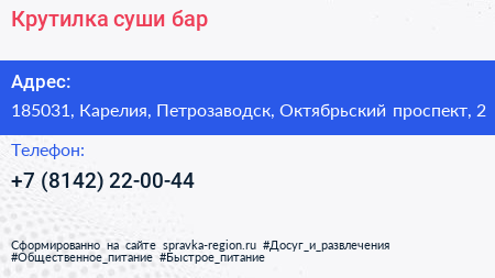 Крутилка, суши-бар по адресу 185031, Карелия, Петрозаводск, Октябрьский проспект, 2 в дальнейшем Организация, размещена в следующих категориях: