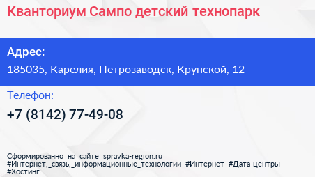 Кванториум Сампо, детский технопарк по адресу 185035, Карелия, Петрозаводск, Крупской, 12 в дальнейшем Организация, размещена в следующих категориях:
