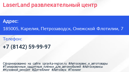 LaserLand, развлекательный центр по адресу 185005, Карелия, Петрозаводск, Онежской Флотилии, 7 в дальнейшем Организация, размещена в следующих категориях: