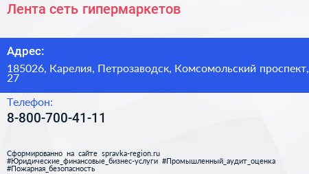 Лента, сеть гипермаркетов по адресу 185026, Карелия, Петрозаводск, Комсомольский проспект, 27 в дальнейшем Организация, размещена в следующих категориях: