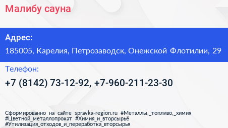 Малибу, сауна по адресу 185005, Карелия, Петрозаводск, Онежской Флотилии, 29 в дальнейшем Организация, размещена в следующих категориях: