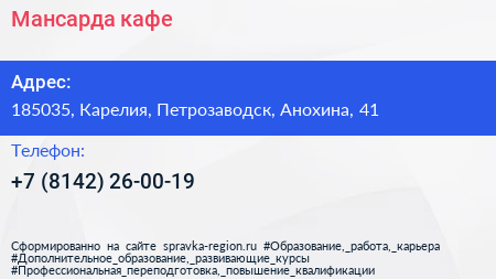 Мансарда, кафе по адресу 185035, Карелия, Петрозаводск, Анохина, 41 в дальнейшем Организация, размещена в следующих категориях: