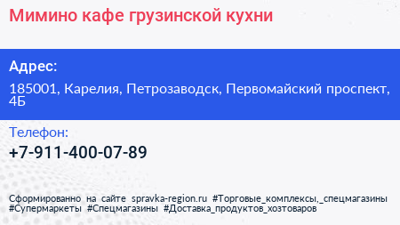 Мимино, кафе грузинской кухни по адресу 185001, Карелия, Петрозаводск, Первомайский проспект, 4Б в дальнейшем Организация, размещена в следующих категориях: