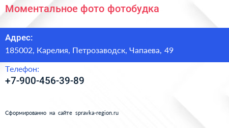 Моментальное фото, фотобудка по адресу 185002, Карелия, Петрозаводск, Чапаева, 49 в дальнейшем Организация, размещена в следующих категориях: