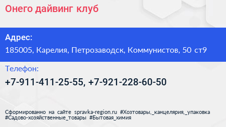 Онего, дайвинг-клуб по адресу 185005, Карелия, Петрозаводск, Коммунистов, 50 ст9 в дальнейшем Организация, размещена в следующих категориях: