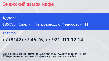 Онежский замок, кафе по адресу 185035, Карелия, Петрозаводск, Федосовой, 44 в дальнейшем Организация, размещена в следующих категориях: