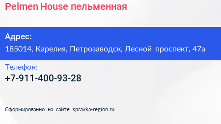 Pelmen House, пельменная по адресу 185014, Карелия, Петрозаводск, Лесной проспект, 47а в дальнейшем Организация, размещена в следующих категориях: