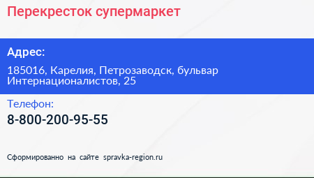 Перекресток, супермаркет по адресу 185016, Карелия, Петрозаводск, бульвар Интернационалистов, 25 в дальнейшем Организация, размещена в следующих категориях: