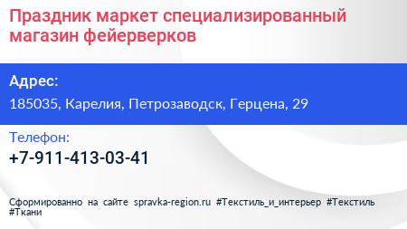 Праздник-маркет, специализированный магазин фейерверков по адресу 185035, Карелия, Петрозаводск, Герцена, 29 в дальнейшем Организация, размещена в следующих категориях: