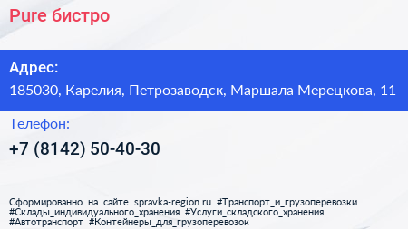 Pure, бистро по адресу 185030, Карелия, Петрозаводск, Маршала Мерецкова, 11 в дальнейшем Организация, размещена в следующих категориях: