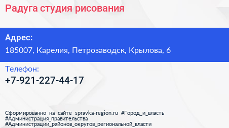 Радуга, студия рисования по адресу 185007, Карелия, Петрозаводск, Крылова, 6 в дальнейшем Организация, размещена в следующих категориях: