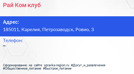 Рай.Ком, клуб по адресу 185011, Карелия, Петрозаводск, Ровио, 3 в дальнейшем Организация, размещена в следующих категориях: