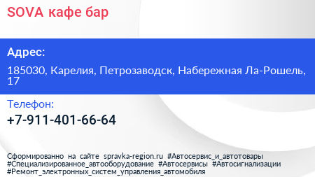 SOVA, кафе-бар по адресу 185030, Карелия, Петрозаводск, Набережная Ла-Рошель, 17 в дальнейшем Организация, размещена в следующих категориях: