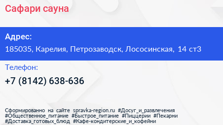 Сафари, сауна по адресу 185035, Карелия, Петрозаводск, Лососинская, 14 ст3 в дальнейшем Организация, размещена в следующих категориях: