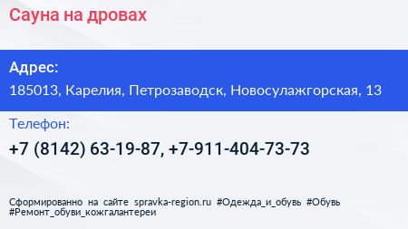 Сауна на дровах по адресу 185013, Карелия, Петрозаводск, Новосулажгорская, 13 в дальнейшем Организация, размещена в следующих категориях:
