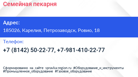 Семейная пекарня по адресу 185026, Карелия, Петрозаводск, Ровио, 18 в дальнейшем Организация, размещена в следующих категориях: