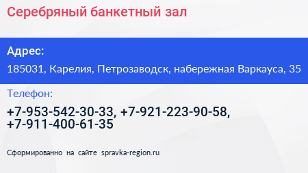 Серебряный, банкетный зал по адресу 185031, Карелия, Петрозаводск, набережная Варкауса, 35 в дальнейшем Организация, размещена в следующих категориях: