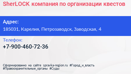 SherLOCK, компания по организации квестов по адресу 185031, Карелия, Петрозаводск, Заводская, 4 в дальнейшем Организация, размещена в следующих категориях: