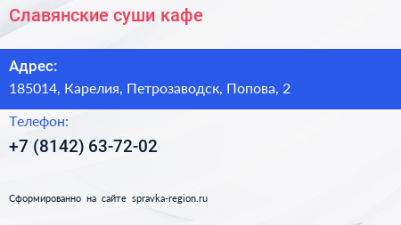 Славянские суши, кафе по адресу 185014, Карелия, Петрозаводск, Попова, 2 в дальнейшем Организация, размещена в следующих категориях:
