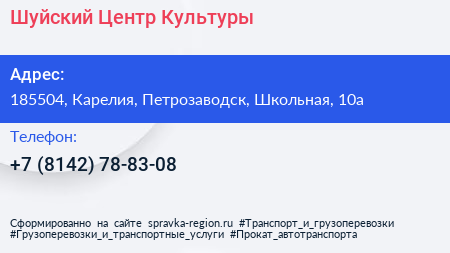 Шуйский Центр Культуры по адресу 185504, Карелия, Петрозаводск, Школьная, 10а в дальнейшем Организация, размещена в следующих категориях: