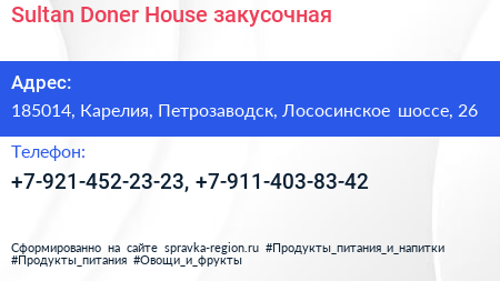 Sultan Doner House, закусочная по адресу 185014, Карелия, Петрозаводск, Лососинское шоссе, 26 в дальнейшем Организация, размещена в следующих категориях: