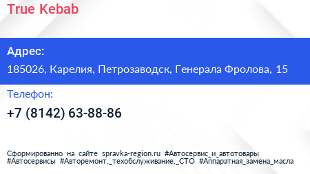 True Kebab по адресу 185026, Карелия, Петрозаводск, Генерала Фролова, 15 в дальнейшем Организация, размещена в следующих категориях:
