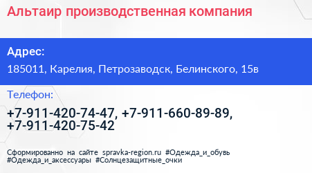 Альтаир, производственная компания по адресу 185011, Карелия, Петрозаводск, Белинского, 15в в дальнейшем Организация, размещена в следующих категориях: