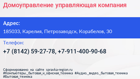 Домоуправление, управляющая компания по адресу 185033, Карелия, Петрозаводск, Корабелов, 30 в дальнейшем Организация, размещена в следующих категориях: