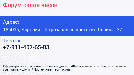 Форум, салон часов по адресу 185035, Карелия, Петрозаводск, проспект Ленина, 37 в дальнейшем Организация, размещена в следующих категориях: