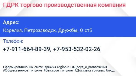 ГДРК, торгово-производственная компания по адресу Карелия, Петрозаводск, Дружбы, 0 ст5 в дальнейшем Организация, размещена в следующих категориях: