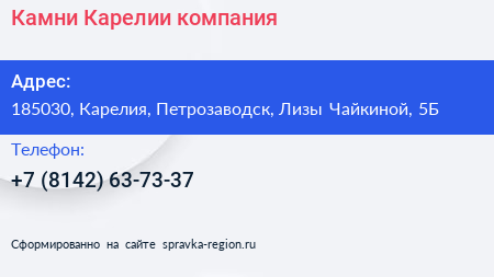 Камни Карелии, компания по адресу 185030, Карелия, Петрозаводск, Лизы Чайкиной, 5Б в дальнейшем Организация, размещена в следующих категориях: