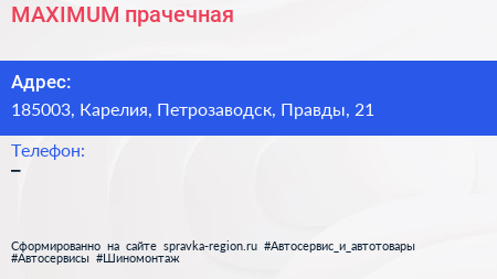 MAXIMUM, прачечная по адресу 185003, Карелия, Петрозаводск, Правды, 21 в дальнейшем Организация, размещена в следующих категориях: