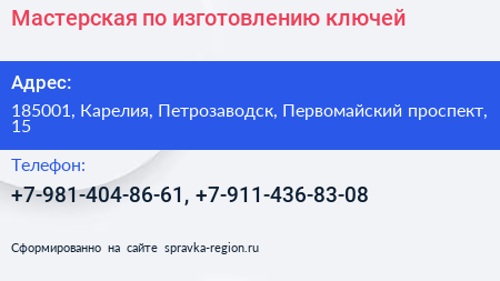 Мастерская по изготовлению ключей по адресу 185001, Карелия, Петрозаводск, Первомайский проспект, 15 в дальнейшем Организация, размещена в следующих категориях: