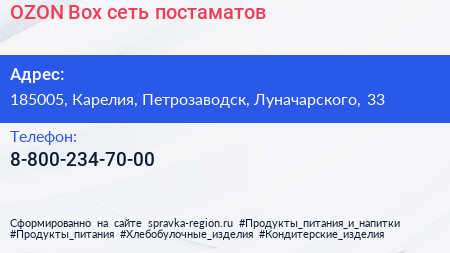 OZON Box, сеть постаматов по адресу 185005, Карелия, Петрозаводск, Луначарского, 33 в дальнейшем Организация, размещена в следующих категориях:
