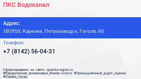 ПКС-Водоканал по адресу 185910, Карелия, Петрозаводск, Гоголя, 60 в дальнейшем Организация, размещена в следующих категориях: