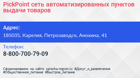 PickPoint, сеть автоматизированных пунктов выдачи товаров по адресу 185035, Карелия, Петрозаводск, Анохина, 41 в дальнейшем Организация, размещена в следующих категориях: