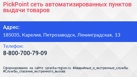 PickPoint, сеть автоматизированных пунктов выдачи товаров по адресу 185035, Карелия, Петрозаводск, Ленинградская, 13 в дальнейшем Организация, размещена в следующих категориях: