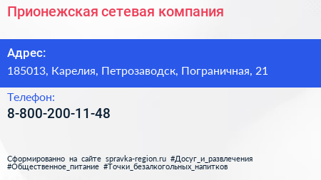 Прионежская сетевая компания по адресу 185013, Карелия, Петрозаводск, Пограничная, 21 в дальнейшем Организация, размещена в следующих категориях: