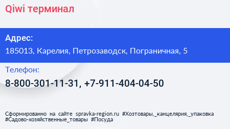 Qiwi, терминал по адресу 185013, Карелия, Петрозаводск, Пограничная, 5 в дальнейшем Организация, размещена в следующих категориях: