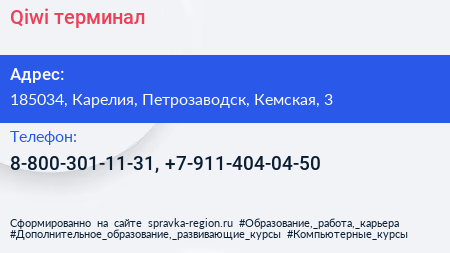 Qiwi, терминал по адресу 185034, Карелия, Петрозаводск, Кемская, 3 в дальнейшем Организация, размещена в следующих категориях: