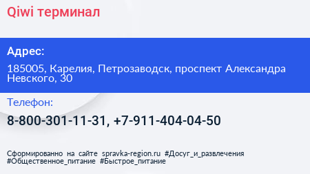 Qiwi, терминал по адресу 185005, Карелия, Петрозаводск, проспект Александра Невского, 30 в дальнейшем Организация, размещена в следующих категориях:
