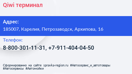 Qiwi, терминал по адресу 185007, Карелия, Петрозаводск, Архипова, 16 в дальнейшем Организация, размещена в следующих категориях: