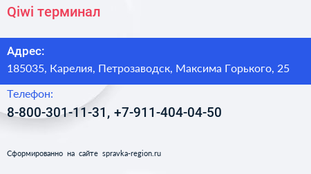 Qiwi, терминал по адресу 185035, Карелия, Петрозаводск, Максима Горького, 25 в дальнейшем Организация, размещена в следующих категориях: