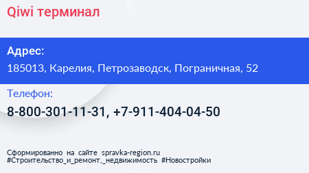 Qiwi, терминал по адресу 185013, Карелия, Петрозаводск, Пограничная, 52 в дальнейшем Организация, размещена в следующих категориях:
