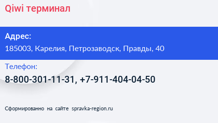Qiwi, терминал по адресу 185003, Карелия, Петрозаводск, Правды, 40 в дальнейшем Организация, размещена в следующих категориях: